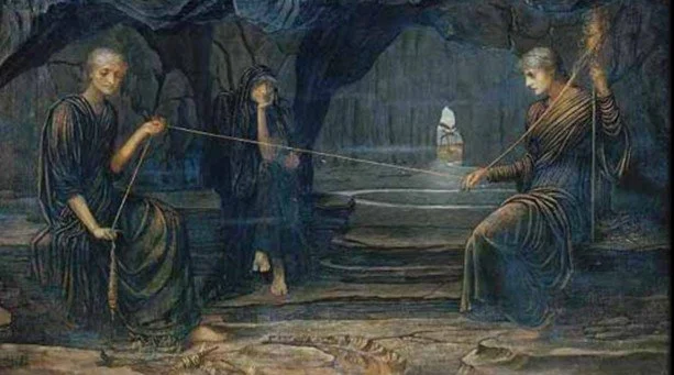 The Three Fates: Clotho, the spinner, Lachesis the alloter, and Atropos the cutter. John Melhuish Strudwick (1849–1935), “A Golden Thread” (1885).